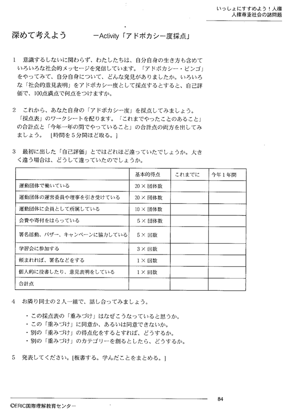 アドボカシー社会とは、一人ひとりの市民が、共通の課題に取り組み、問題解決行動をとる社会のことです。圧倒的多数の市民が、市民的行動、アドボカシーに取り組むようになる社会、それがERICの人材育成、ESDが目指すところなのです。